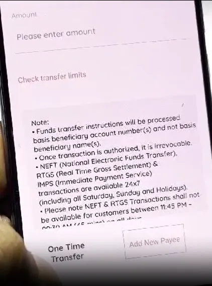 Step 3: Select from the options “One time transfer OR Add Payee” to transfer funds to another bank account.