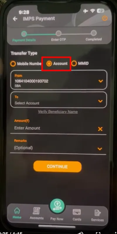 Select the Account number option from these three and fill the details if you have already added the beneficiary.