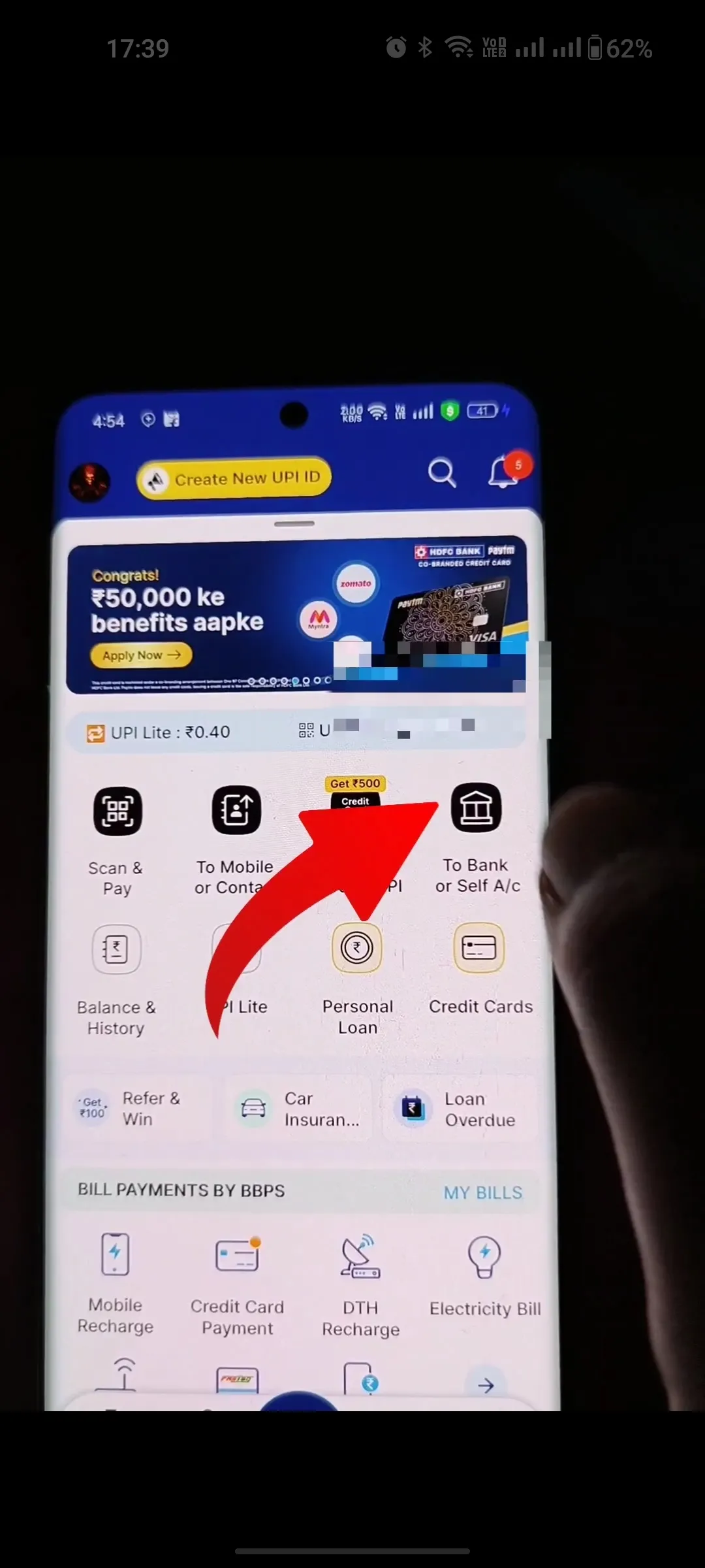Open your Paytm app, look for the option “To Bank or Self A/c”.